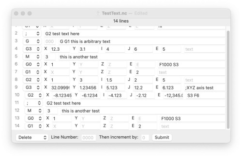 Delete will only work on one line at a time, but it has an increment function, like Append does. It only uses 2 values and it gives you a large viewing area. Entering a line number and clicking Submit will delete that line. If you enter a line number, an increment value, and click the Submit button, that line will be deleted and the "Line Number:" value will be incremented by the "Then increment by:" value.