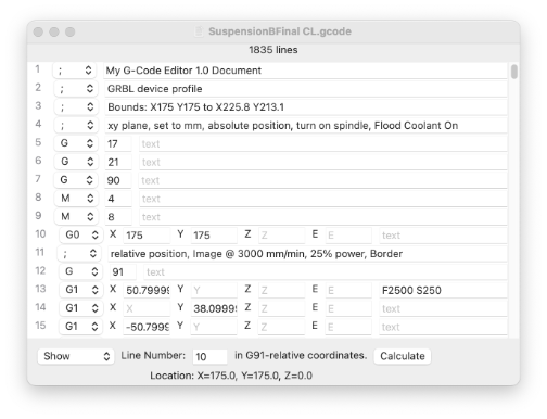 Show is a simple display of the coordinate values for the line number you enter. It is used to show the relative coordinates for that line's absolute G values or absolute coordinates for that line's relative G values. This is useful when your code switches back and forth between relative and absolute coordinates. The coordinate system is determined by the G90 and G91 commands in the code. G90 (absolute coordinates) are the default when G91 (relative coordinates) are not specified.